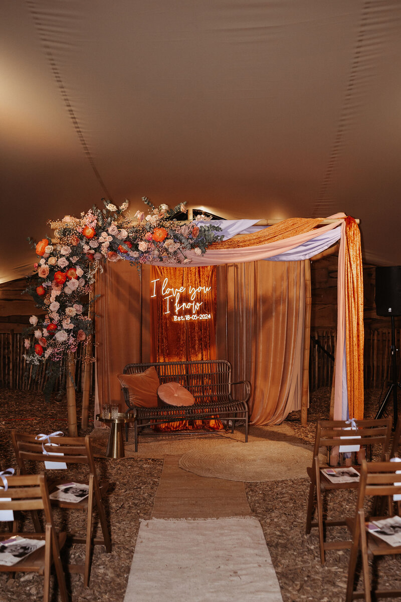 Geen zorgen. Binnen biedt Het Ruiterhuys een prachtige ceremonieplek in een voormalige paardenbak – warm, sfeervol en intiem.